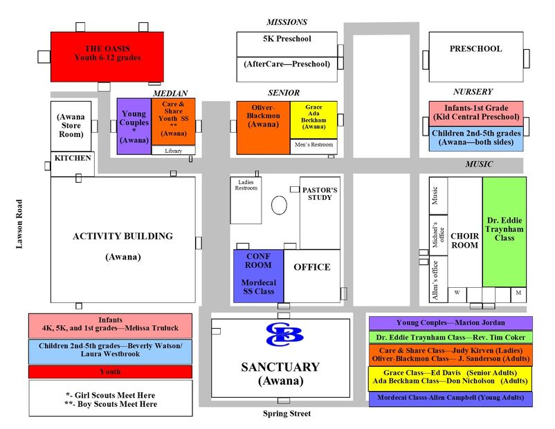 We have included a campus map for your convenience. It outlines Sunday School rooms as well as other ministries. As always, please feel free to call the church office with any questions you may have. We know it's a big campus and want to do all we can to help you.